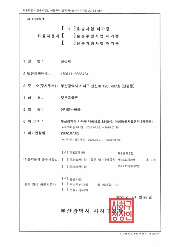 부용물류 화물운송허가증