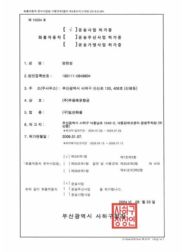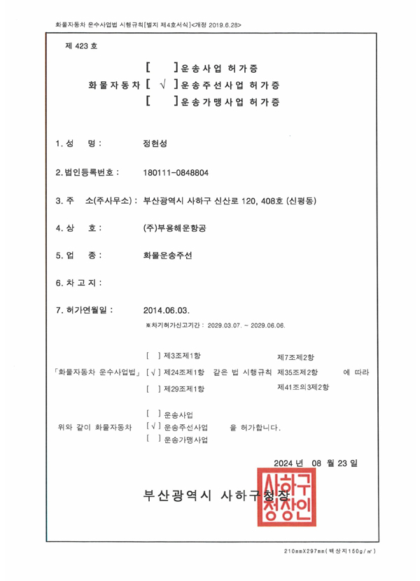 부용해운항공 화물운송사업허가증