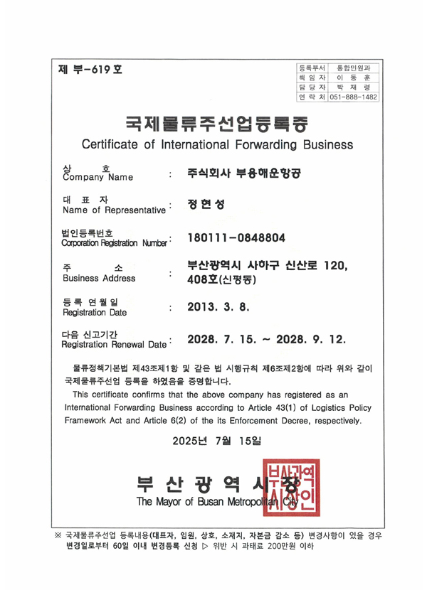 부용해운항공 국제물류주선업등록증