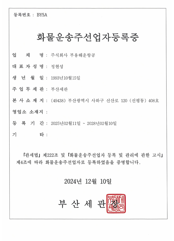 부용해운항공 화물주선허가증